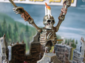 Czaszki w wykuszach i te luzem porozrzucane tu i ówdzie, zostały pomalowane farbą Dheneb Stone, następnie potraktowane washem Devlan Mud. Finalnie zostały drybrushowane Skull White. Generalnie z tych czaszek jestem najmniej zadowolony. Będę musiał to kiedyś poprawić.
